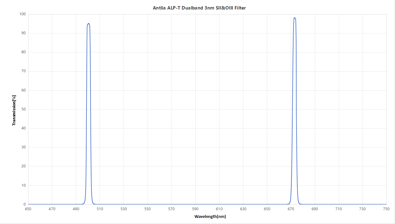 The ALP-T dual band 3nm SII&OIII filter is a dual narrowband filter, which lets the deep red Sulfur-II 672.4nm and the blue-green OIII (500.7nm) lines through and is primarily engineered for color cameras to assist astrophotographers taking deep sky images with superior SNR(Signal to Noise Ratio). With an FWHM half-bandwidth designed at 3nm and achieving an optical density (OD) of 4.5 on unwanted wavelengths, it works strongly in blocking light pollution, moonlight, and airglow, leading to enhanced contrast in nebulae images by effectively passing the SII and OIII emission lines signal only.